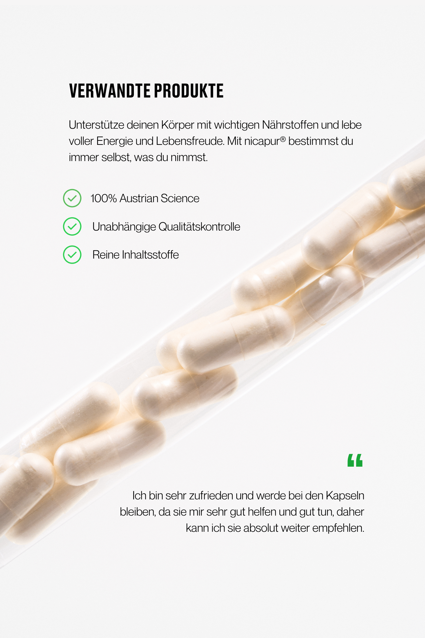 Vitamine und Mineralstoffe können dich neben einer ausgewogenen Ernährung, Sport und Cremes dabei unterstützen, dein Hautbild an Gesäß und Beinen zu verbessern. Wir von NICApur® bieten dir im Onlineshop eine Auswahl an einfach dosierbaren Präparaten, welche für eine strahlend schöne Haut besonders wichtig sind.