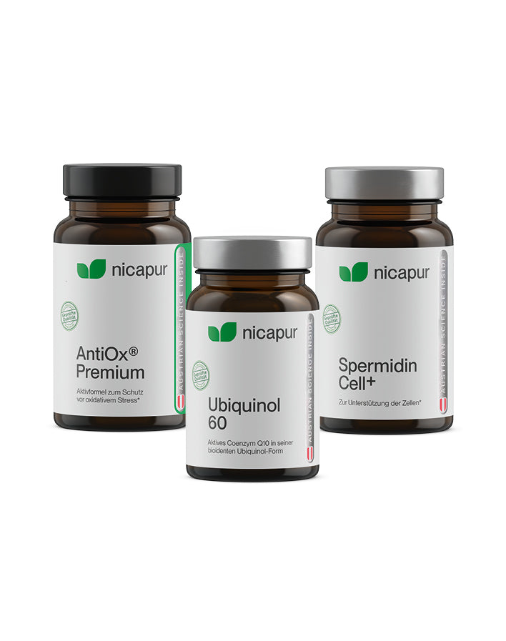 Dieses Bundle vereint drei Produkte für deine Zellen: AntiOx® Premium mit kombinierten Antioxidantien, Spermidin und Ubiquinol – die bioaktive Form von Coenzym Q10. Für alle, die vital und aktiv älter werden möchten.