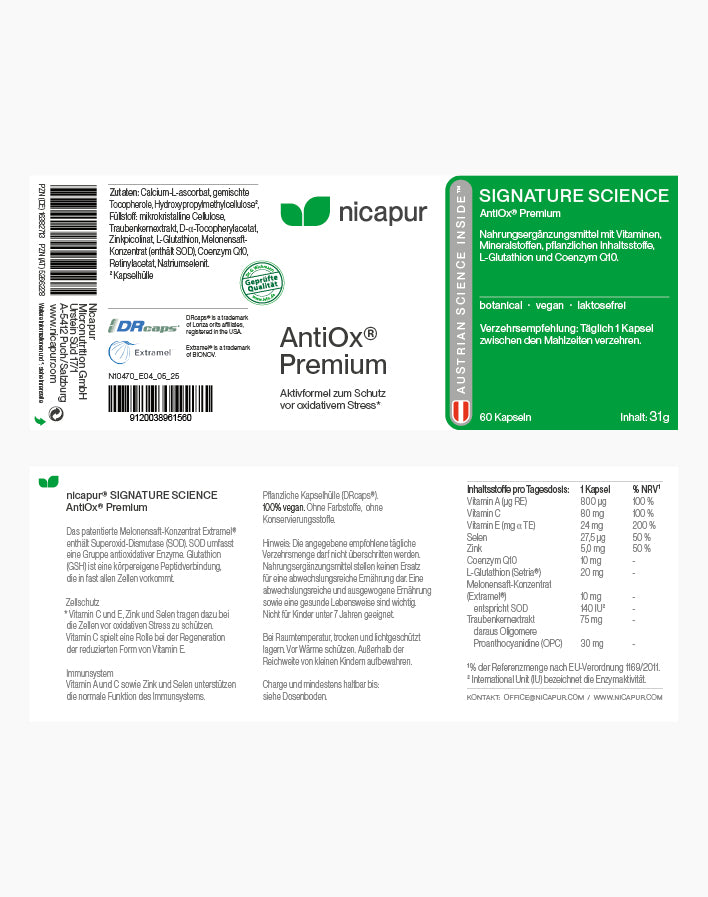 Zutaten: Calcium-L-ascorbat, gemischte Tocopherole, Hydroxypropylmethylcellulose (Kapselhülle), Füllstoff: mikrokristalline Cellulose; Traubenkernextrakt; D-α-Tocopherylacetat, Zinkpicolinat, L-Glutathion, Melonensaft-Konzentrat (enthält SOD), Coenzym Q10, Retinylacetat, Natriumselenit.