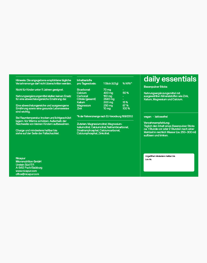Verzehrsempfehlung: Täglich den Inhalt eines Basensticks ca. 1 Stunde vor oder 2 Stunden nach einer Mahlzeit in reichlich Wasser (ca. 250–300 ml) auflösen und trinken.