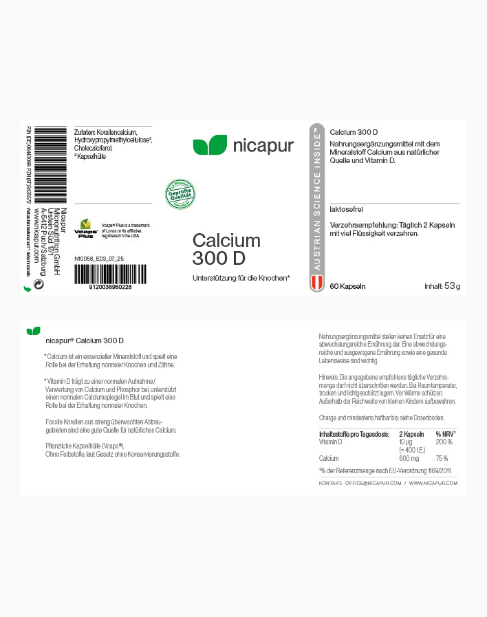 Calcium 300 D kombiniert natürliches Calcium aus fossilen Korallen mit Vitamin D. Calcium ist das fünfthäufigste Element der Erdkruste und kommt in Böden, Gesteinen, Gewässern und Lebewesen vor. Fossile Korallen aus streng überwachten Abbaugebieten sind eine gute Quelle für natürliches Calcium. Korallen nehmen im Laufe ihres Lebens neben Calcium viele weitere Mineralien und Spurenelemente auf, die sie in ihre Strukturen einbauen. Calcium macht in etwa ein Kilogramm des Körpergewichts eines erwachsenen Menschen aus. Die Knochen stellen den größten Calciumspeicher im Körper dar.