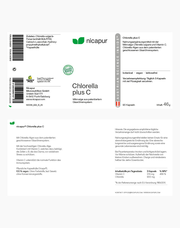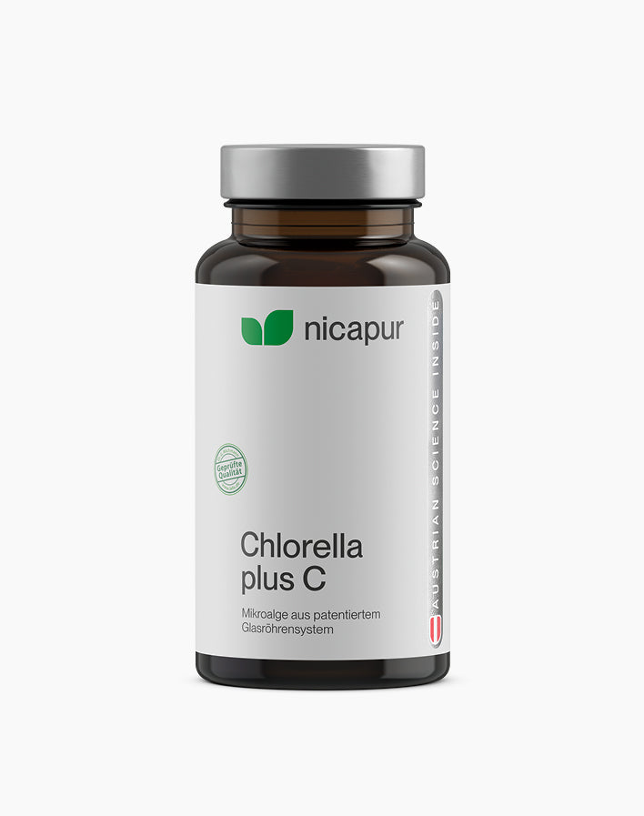 Chlorella plus C ist ein Nahrungsergänzungsmittel mit der Mikroalge Chlorella vulgaris und Vitamin C.