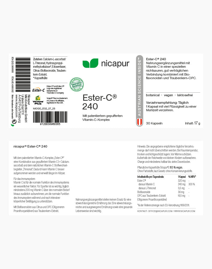 Zutaten: Calciumascorbat/L-Threonat, Hydroxypropylmethylcellulose (Kapselhülle), Erbsenfaser, Citrus-Bioflavonoide, Traubenkern-Extrakt.