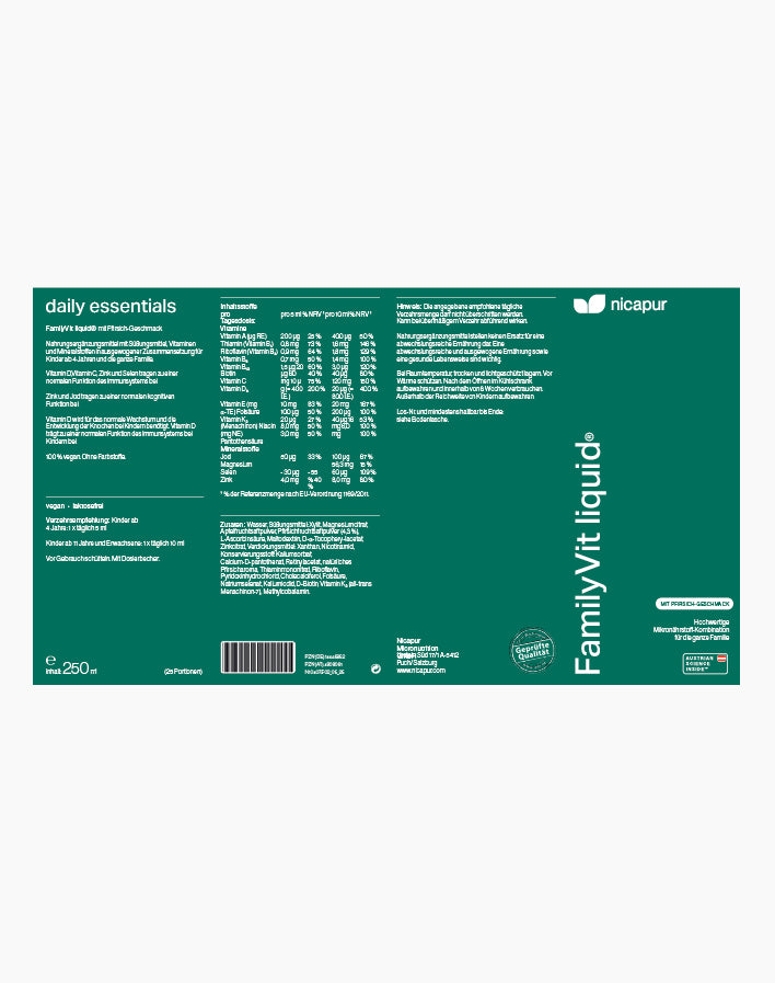 FamilyVit liquid® unterstützt die tägliche Ernährung mit essenziellen Mikronährstoffen. Der einfach zu dosierende Saft mit fruchtig-leckerem Pfirsich-Geschmack bietet ein breites Spektrum an Vitaminen, Mineralstoffen und Spurenelementen für die ganze Familie und unterstützt so Wohlbefinden und Vitalität von Mama, Papa und Kids! Gerade in der nass-kalten Jahreszeit sowie bei vermehrter körperlicher und geistiger Belastung sollte der Körper mit ausreichend Nährstoffen versorgt werden. Kombiniert mit Jod und Vitamin D3 bietet der Saft die tägliche Basisversorgung mit allen wichtigen Nährstoffen. Vitamine, Mineralstoffe und Spurenelemente in ausgewogener Zusammensetzung unterstützen die körpereigenen Abwehrkräfte und den Energiestoffwechsel. Die regelmäßige Zufuhr von essenziellen Nährstoffen sorgt für Vitalität und Wohlbefinden von groß & klein!