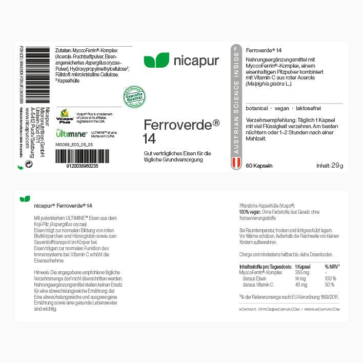 Zutaten: MyccoFerrin®-Komplex (Acerola-Fruchtsaftpulver, Eisenangereichertes Aspergillus oryzae-Pulver), Hydroxypropylmethylcellulose², Füllstoff: mikrokristalline Cellulose.