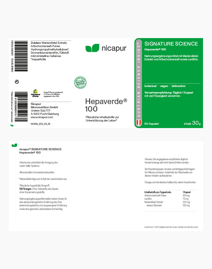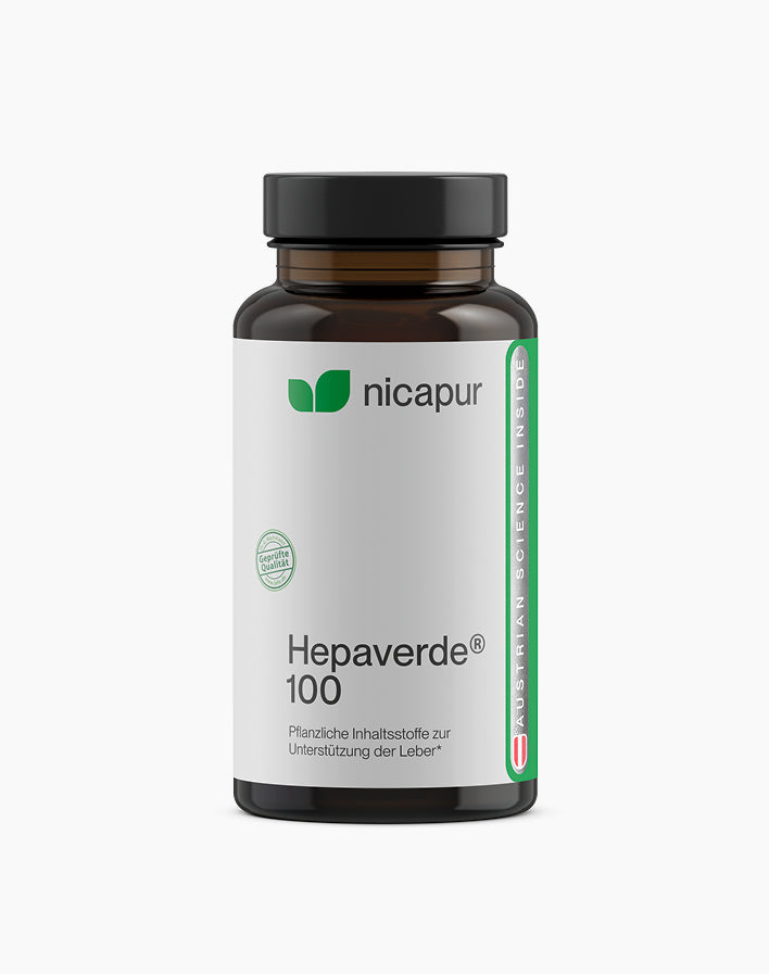 Hepaverde® 100 ist ein Nahrungsergänzungsmittel mit Mariendistel-Extrakt und Artischockensaft sowie Lecithin.