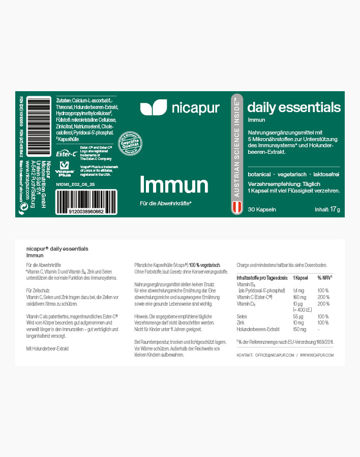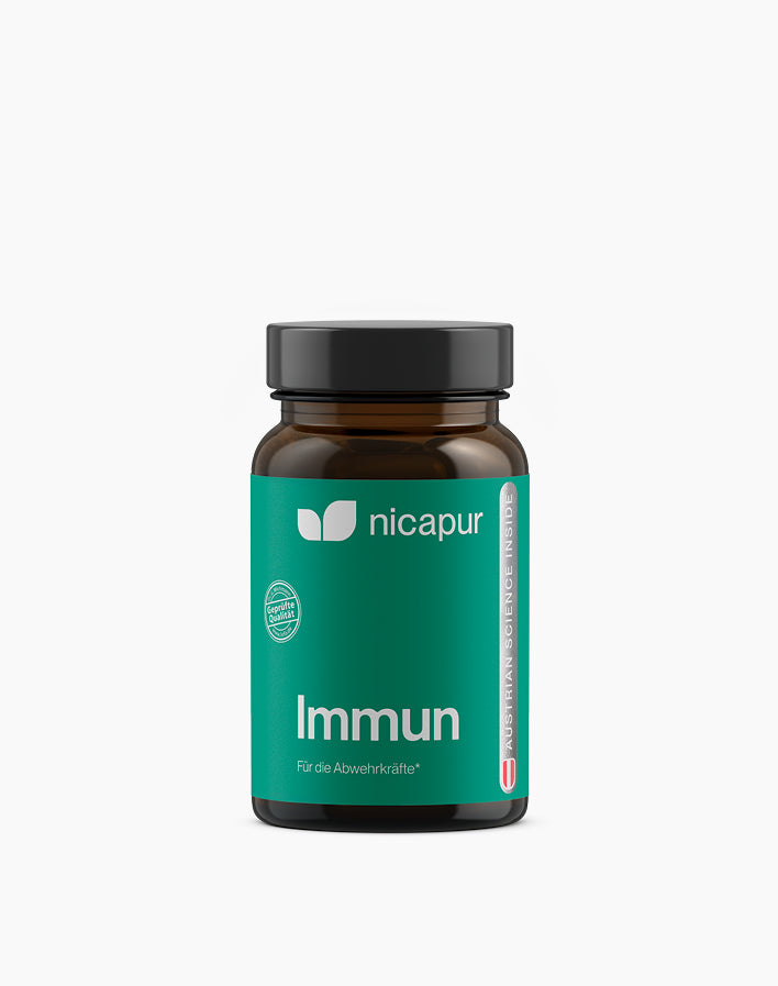 nicapur® Immun ist ein Nahrungsergänzungsmittel mit 5 Mikronährstoffen zur Unterstützung des Immunsystems und Holunderbeeren-Extrakt.