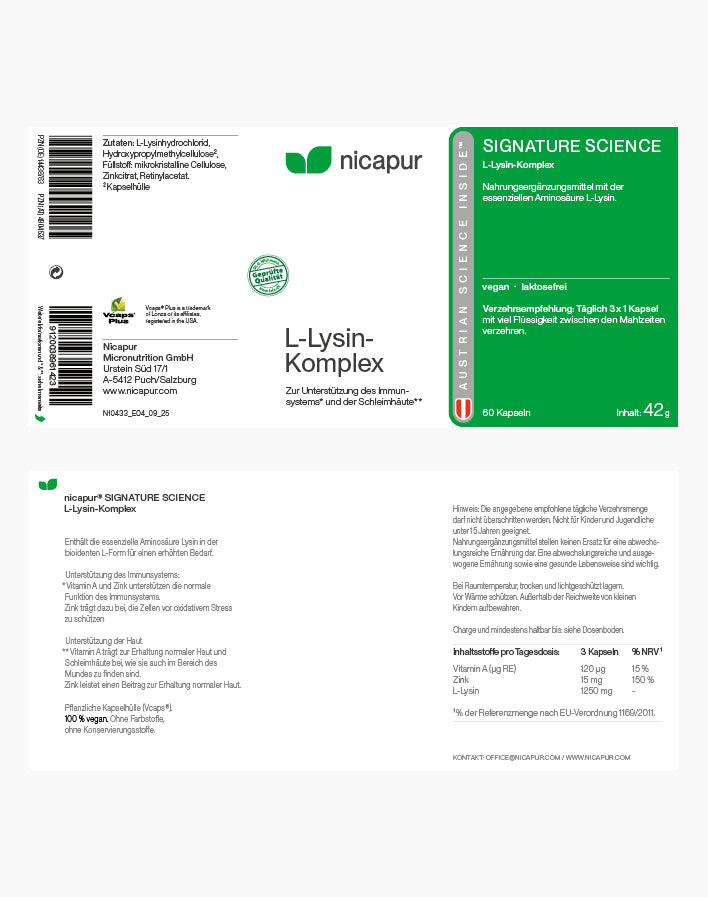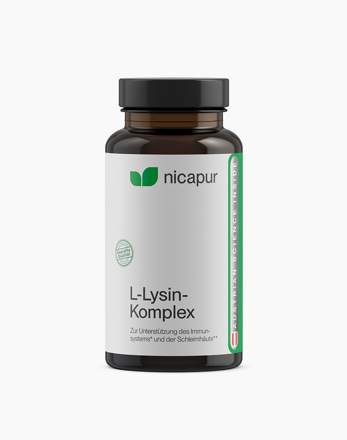 L-Lysin ist eine essenzielle, sprich lebensnotwendige Aminosäure und Bestandteil verschiedener Proteine im Körper. Gemeinsam mit L-Arginin und L-Histidin zählt L-Lysin zu den basischen Aminosäuren und ist Baustein von Kollagen (=Grundstruktur unserer Haut). Der Organismus kann L-Lysin nicht selbst bilden, weshalb es über die Nahrung zugeführt werden muss. L-Lysin kommt überwiegend in tierischen Lebensmitteln vor. Kombiniert mit Vitamin A und Zink zur Unterstützung einer gesunden Schleimhaut und Haut sowie für ein abwehrstarkes Immunsystem.