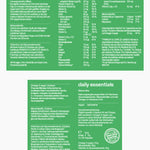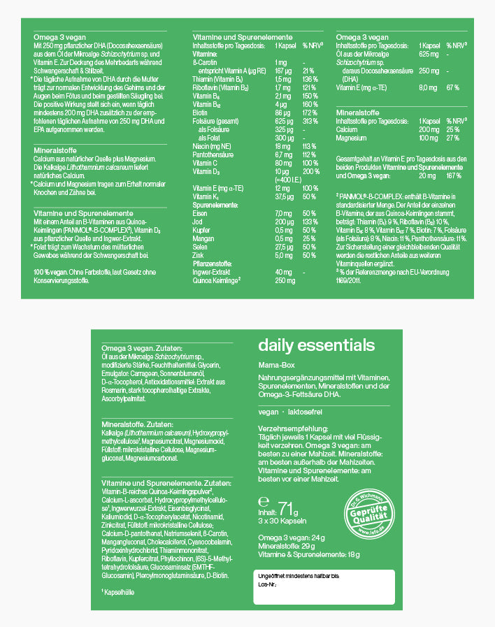 Zutaten: Quinoa-Keimlingspulver**, Calcium-L-ascorbat, Hydroxypropylmethylcellulose (Kapselhülle), Ingwerwurzel-Extrakt, Eisenbisglycinat, Kaliumiodid, D-α-Tocopherylacetat, Nicotinamid, Zinkcitrat, Füllstoff: mikrokristalline Cellulose; Calcium-D-pantothenat, Natriumselenit, β-Carotin, Mangangluconat, Cholecalciferol, Cyanocobalamin, Pyridoxinhydrochlorid, Thiaminmononitrat, Riboflavin, Kupfercitrat, Phyllo-chinon, (6S)-5- Methyltetrahydrofolsäure-Glucosaminsalz, Pteroylmonoglutaminsäure, D-Biotin.