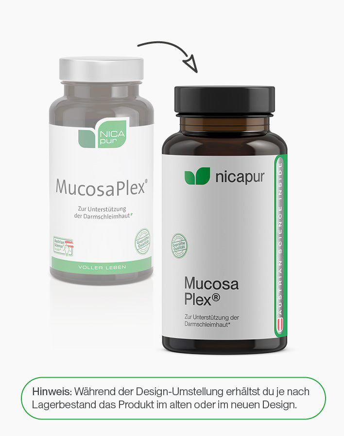MucosaPlex® ist speziell zur Unterstützung der Darmschleimhaut konzipiert - mit Glutamin, Grüntee- und Kamillen-Extrakt sowie Zink.