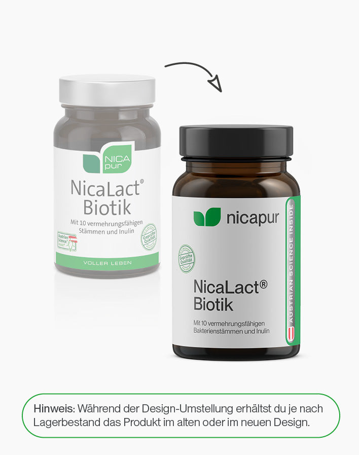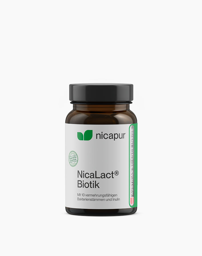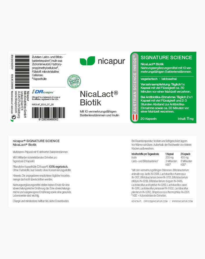 Die begleitende Einnahme eines Probiotikums zur Antibiotika-Therapie unterstützt das Darmmikrobiom. Für diese kurzzeitige Anwendung bietet NicaLact® Biotik die ideale Dosierung und Verpackungsgröße.