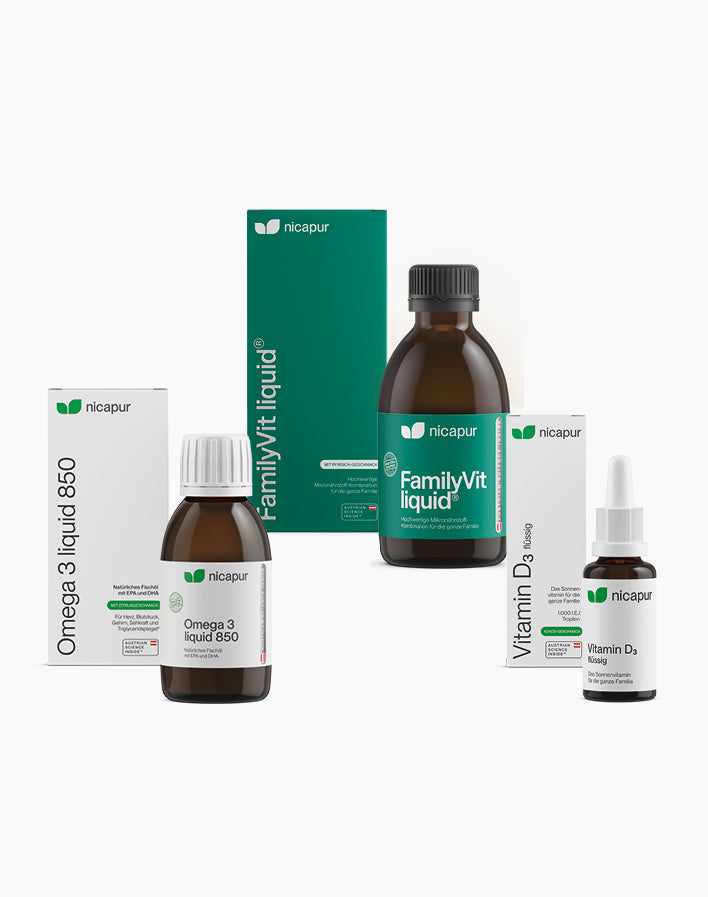 Mit dem nicapur® Essential-Bundle mit flüssigen Nährstoffen kannst du dich auch ganz ohne Kapseln schlucken täglich bestens mit den wichtigsten Nährstoffe versorgen.