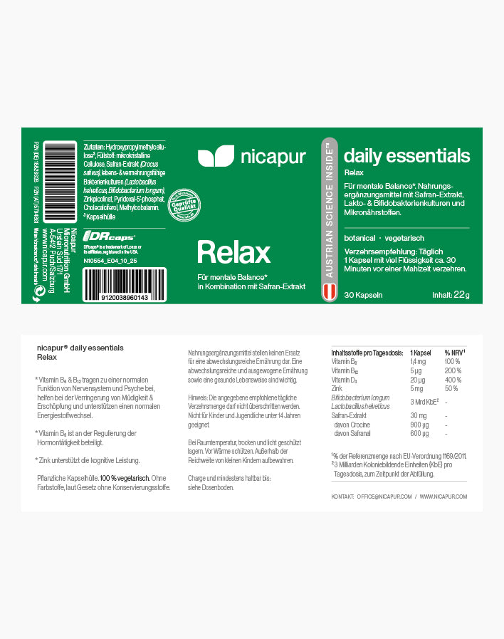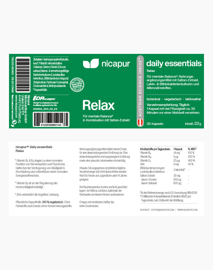 Die berufliche Belastung kann zu Stress führen, der nicht nur die Leistungsfähigkeit und die Gesundheit beeinträchtigt, sondern auch die Lebensqualität jeder und jedes Einzelnen. Die langfristige Auswirkung einer anhaltenden mentalen Belastung kann sich auch auf das Privatleben auswirken und zwischenmenschliche Beziehungen negativ beeinflussen. Um die innere Balance zu unterstützen und zur Entspannung beizutragen, wurde das neue Spezialpräparat RELAX entwickelt. Es basiert auf einer gezielten Kombination aus Lacto- und Bifidobakterien sowie Safran-Extrakt, optimal ergänzt durch die Vitamine B6, B12 und D3, sowie dem Spurenelement Zink.