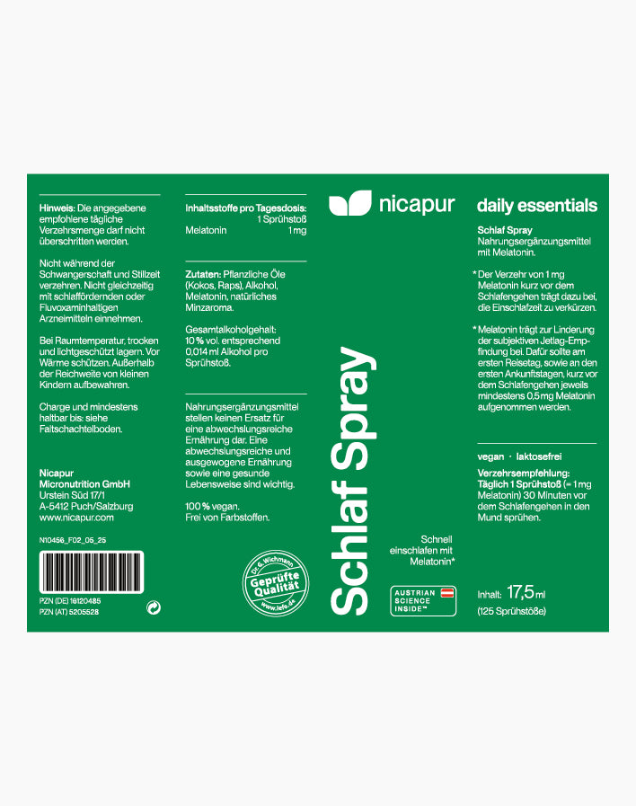 nicapur® Schlaf Spray unterstützt dich beim Einschlafen und lindert Jetlag: Mit der körpereigenen Substanz Melatonin und natürlichem Minzaroma. Melatonin hilft dabei, die Einschlafzeit zu reduzieren, um am nächsten Morgen erholt in den Tag zu starten. Dein idealer Begleiter im Alltag und auf Reisen.
