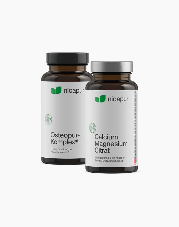 Zwei Produkte – ein Ziel: optimale Untertützung für die Knochen. Das nicapur® Bundle kombiniert den Osteopur-Komplex mit einem extra an Calcium und Magnesium in der optimal bioverfügbarern Citrat Form. Gemeinsam unterstützen sie den Erhalt der Knochenstrukturen - ideal für Alltag, Sport und alle Lebensphasen.