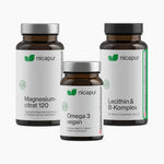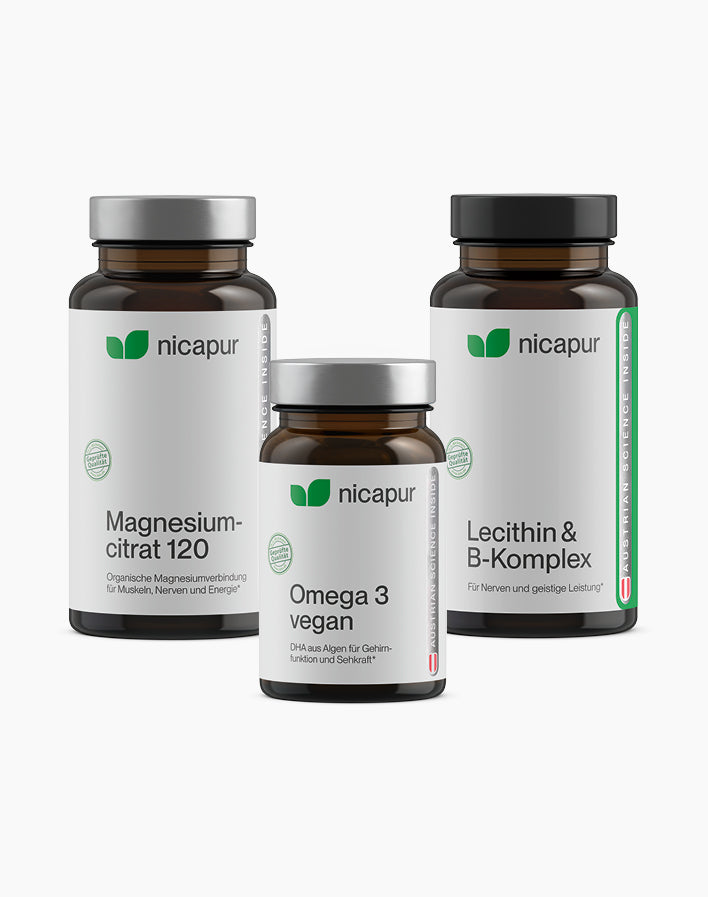 Das nicapur® Bundle für Nerven und Psyche kombiniert drei gezielte Formulierungen: Lecithin & B Komplex, Magnesiumcitrat, sowie Omega 3 vegan mit der Omega-3-Fettsäure DHA – wichtig für die Gehirnfunktion. Für alle, die fokussiert durch den Tag gehen möchten.