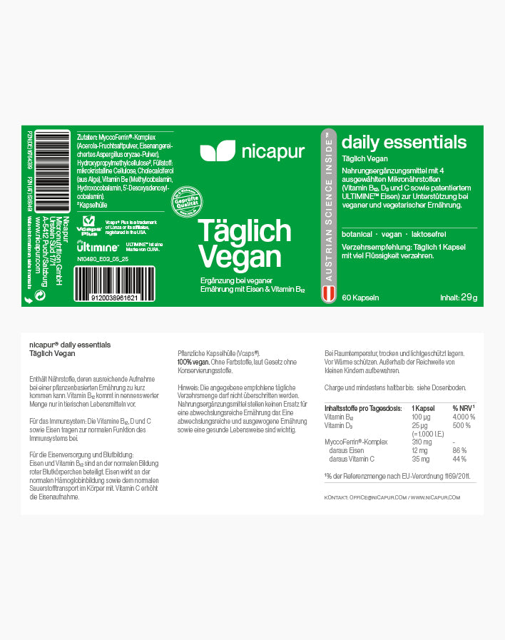 Zutaten: MyccoFerrin®-Komplex (Acerola-Fruchtsaftpulver, Aspergillus-oryzae-Pulver), Füllstoff: Cellulosepulver; Hydroxypropylmethylcellulose (Kapselhülle), Cholecalciferol (aus Alge), Vitamin B12 (Methylcobalamin, Hydroxocobalamin, 5’-Desoxyadenosylcobalamin).