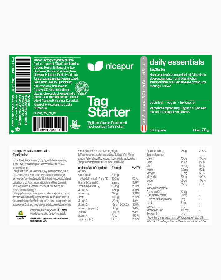Mach TagStarter zu deiner täglichen Nährstoffroutine. Das All-in-one-Produkt liefert 25 vegane Nährstoffe für mehr Energie, Vitalität und Wohlbefinden – perfekt für alle, die im Alltag körperlich oder geistig gefordert sind. Ob in der nass-kalten Jahreszeit, bei Stress im Job oder wenig Bewegung: TagStarter unterstützt dich dabei, deinen Körper täglich mit wichtigen Vitaminen, Spurenelementen und ausgewählten Pflanzenstoffen zu versorgen – einfach, smart und zuverlässig.