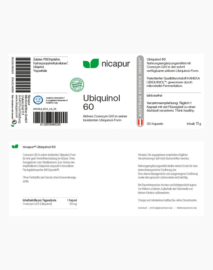 • Ohne Emulgatoren oder Stabilisatoren: Zum Schutz des empfindlichen Ubiquinols verpackt in speziellen Fischgelatineperlen (NICApearls®)