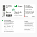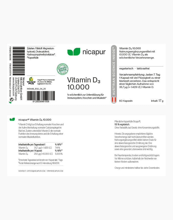 Vitamin D3 10.000 ist ein Nahrungsergänzungsmittel. Eine Kapsel enthält 10.000 I.E. (Internationale Einheiten) Vitamin D3 als wöchentliche Verzehrsmenge.