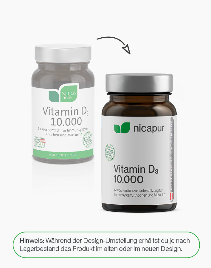 Vitamin D3 10.000 ist ein Nahrungsergänzungsmittel. Eine Kapsel enthält 10.000 I.E. (Internationale Einheiten) Vitamin D3 als wöchentliche Verzehrsmenge.