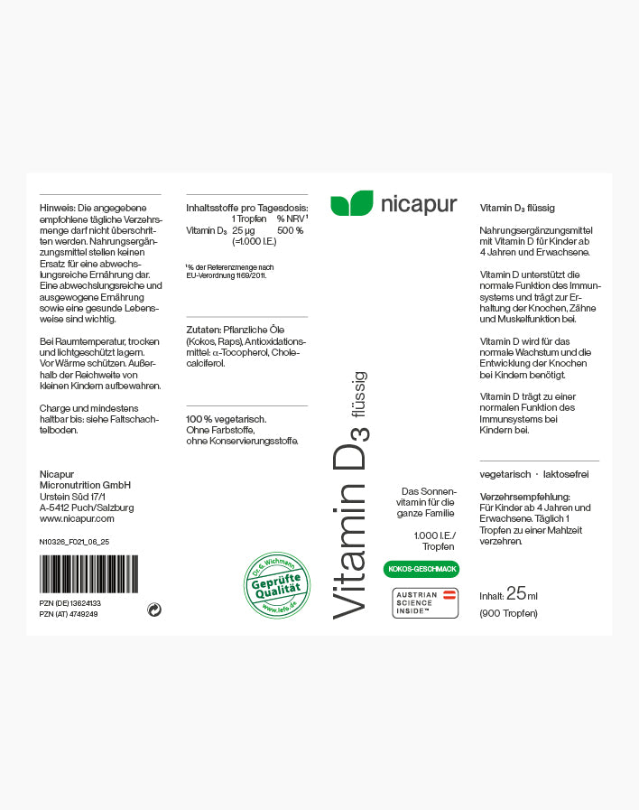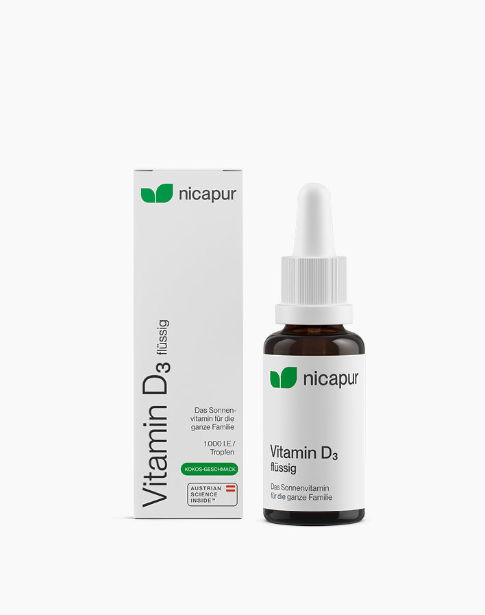 Den Großteil von Vitamin D bilden wir mithilfe des Sonnenlichts selbst in unserer Haut. Für die Eigensynthese ist jedoch ein UV-Index von >3 nötig, dieser wird in den westlichen Breitengraden nur zu wenigen Jahres- und Tageszeiten erreicht. Von Herbst bis Frühling, bei wenig Aufenthalt im Freien, oder der Verwendung von einem hohem LSF im Sommer, kann die Vitamin D Bildung daher reduziert sein. In flüssiger Form mit angenehmem Kokos-Geschmack ist dieses Produkt es besonders einfach in der Anwendung und eignet sich für die ganze Familie - nur 1 Tropfen täglich!