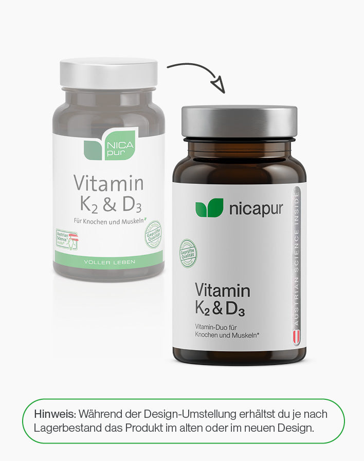 • Die Vitamine K2 und D3 sind im Körper Partner für einen normalen Knochenstoffwechsel.