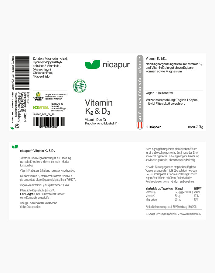 Vitamin D3 unterstützt die Calciumaufnahme, während K2 dafür sorgt, dass Calcium in die Knochen gelangt - die Kombination wirkt synergistisch.